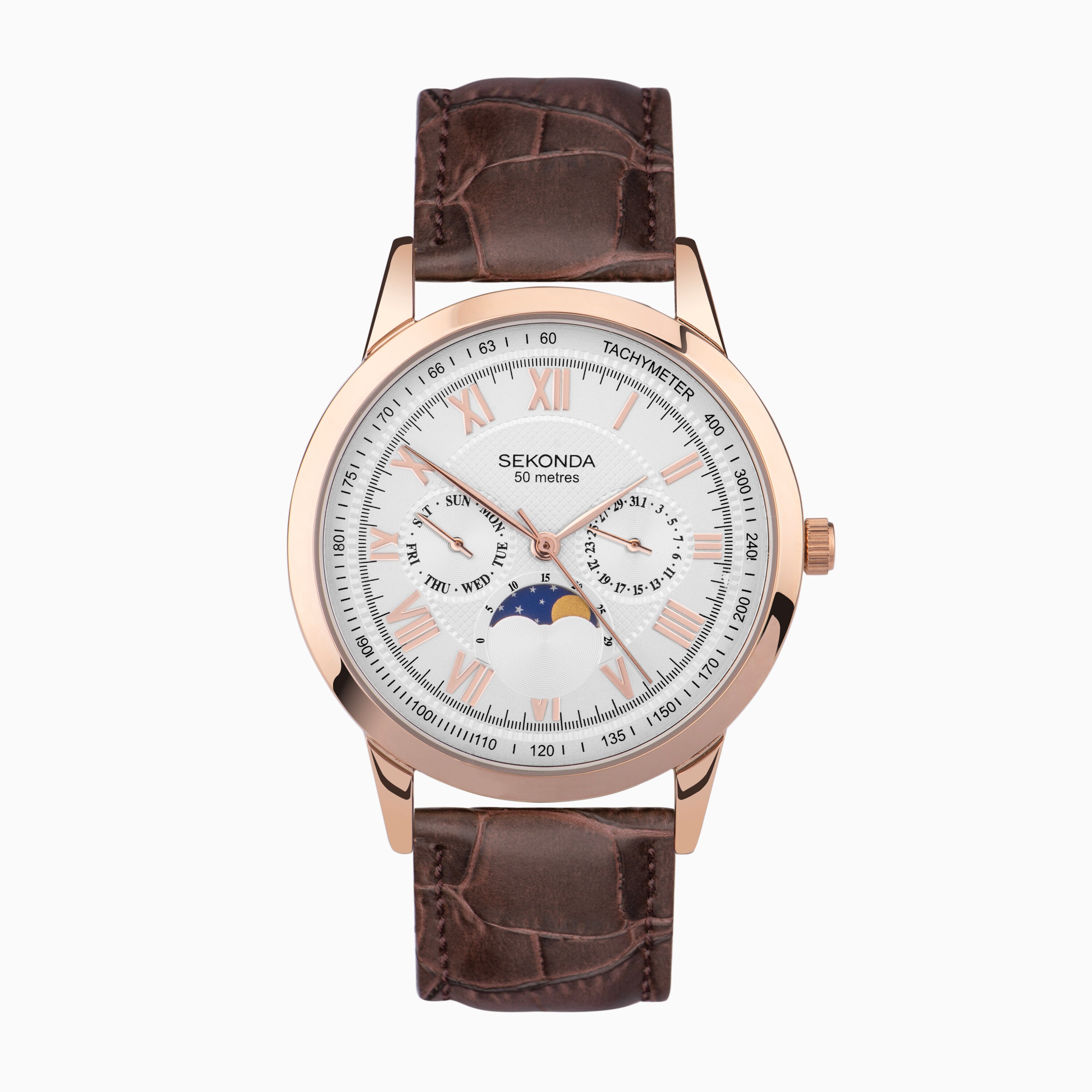 Sekonda Armstrong Moon Phase Men’s Watch | Rose Gold Alloy Case & Brown Leather Strap with Silver Dial | 30148