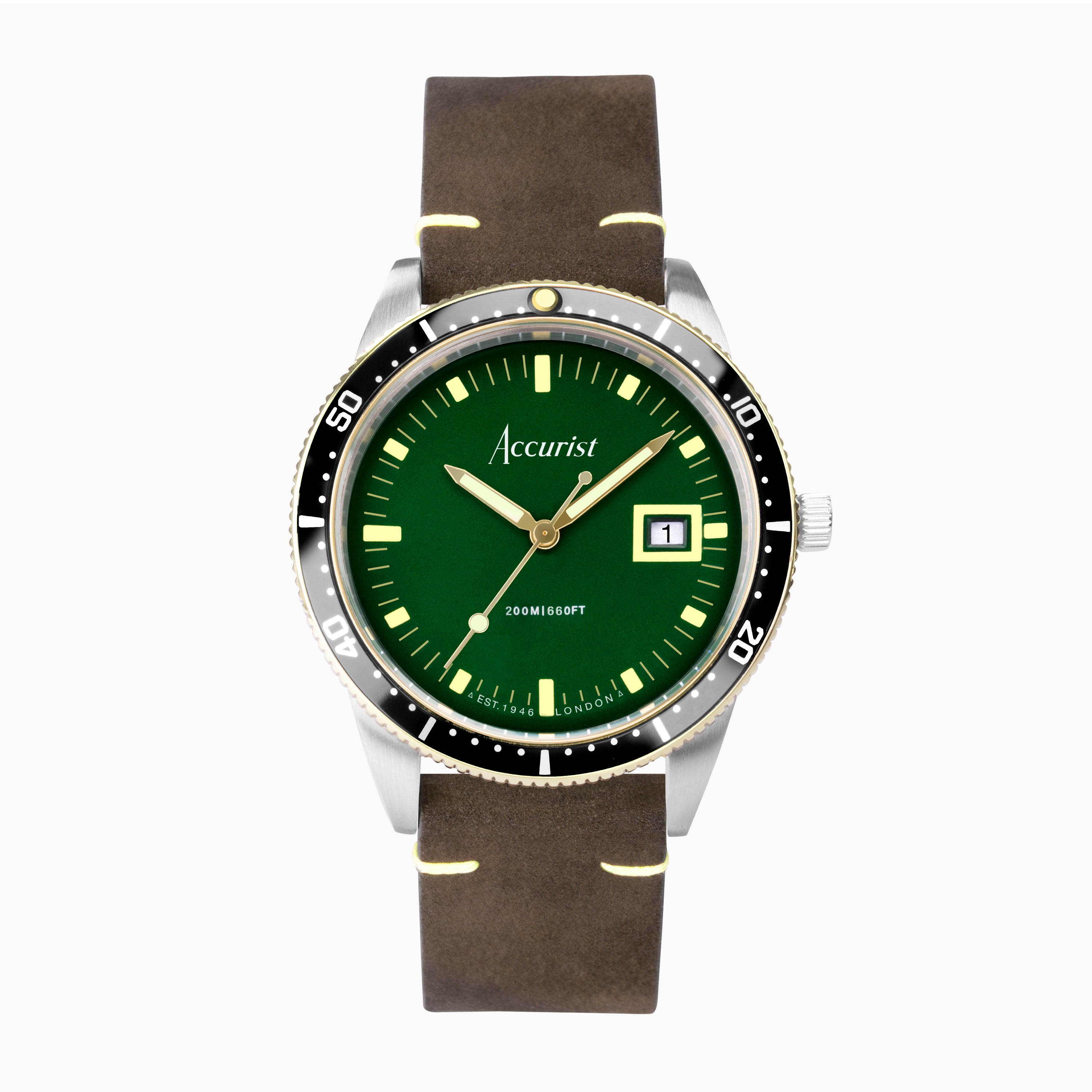 Accurist Dive Men's Watch | Two Tone Case & Brown Leather Strap with Samphire Green Dial | 42mm