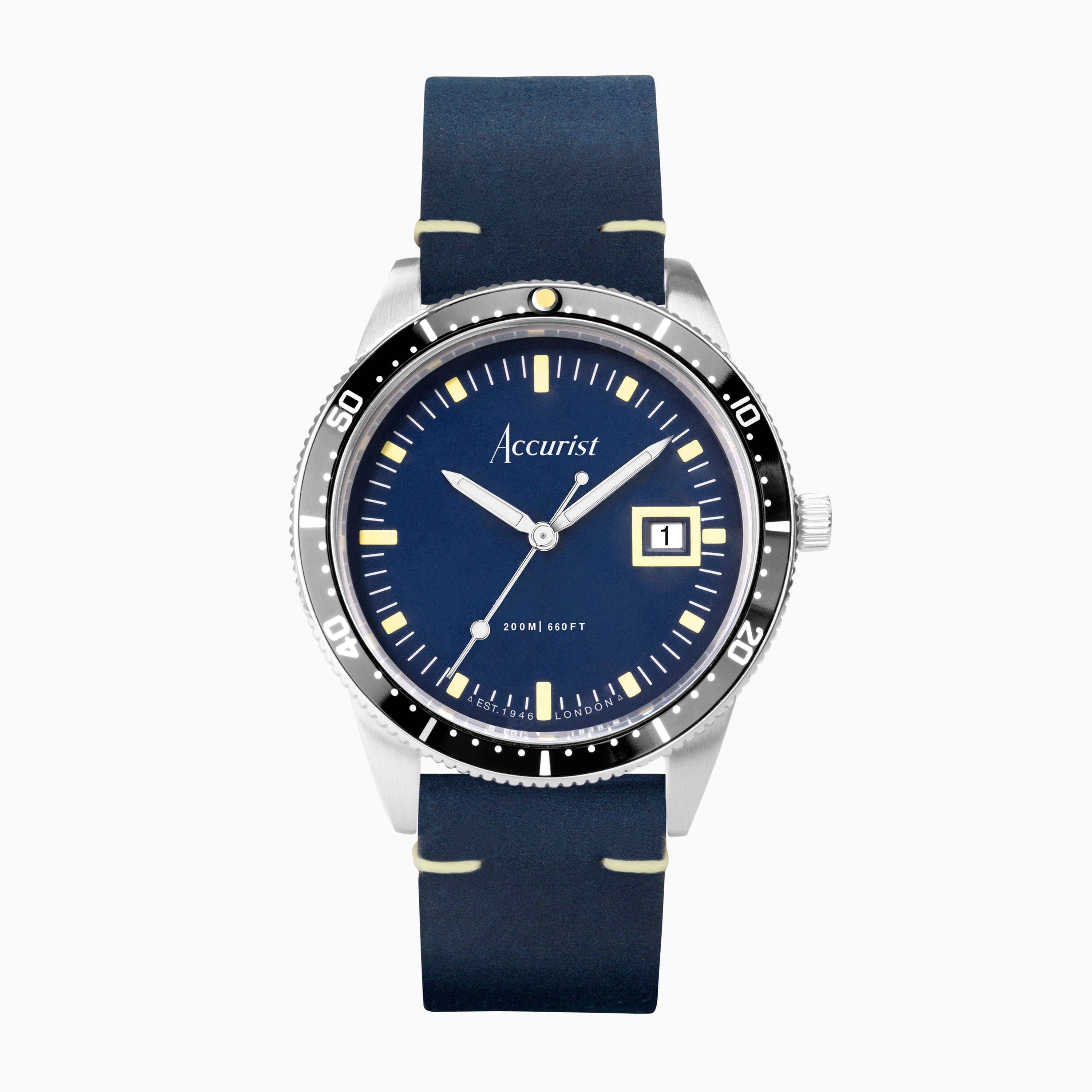 Accurist Dive Men's Watch | Silver Case & Blue Leather Strap with Windermere Blue Dial | 42mm