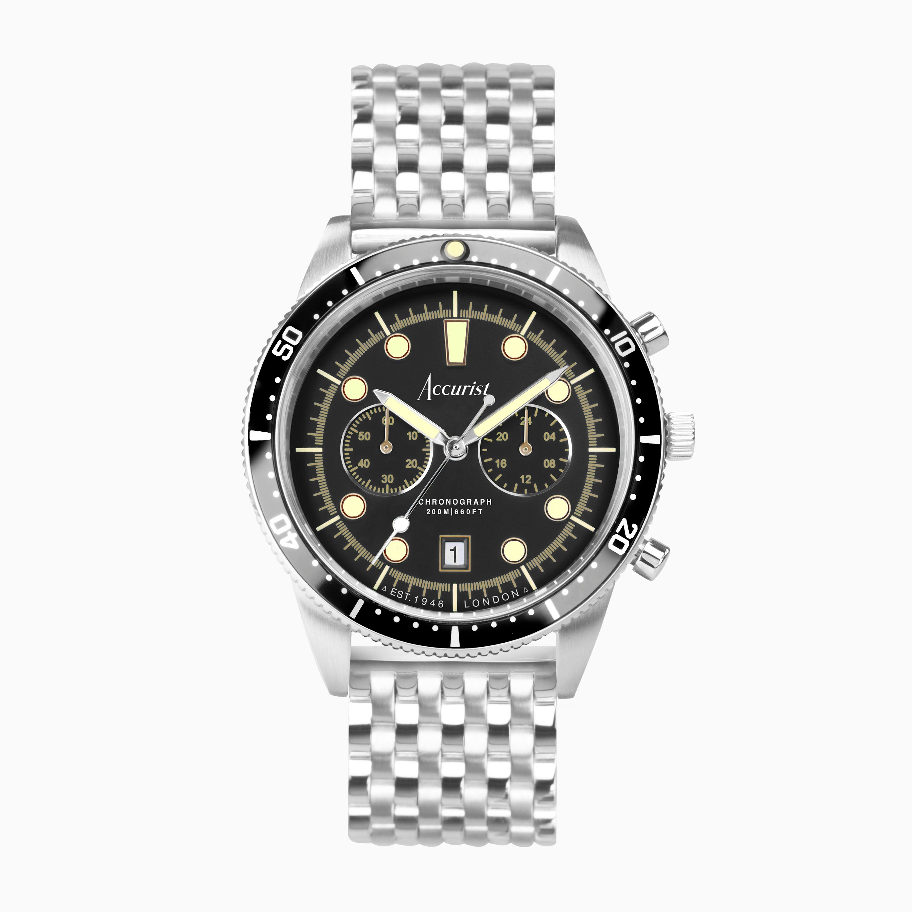 Accurist Dive Men's Chronograph Watch | Silver Case & Stainless Steel Bracelet with Black Dial | 42mm