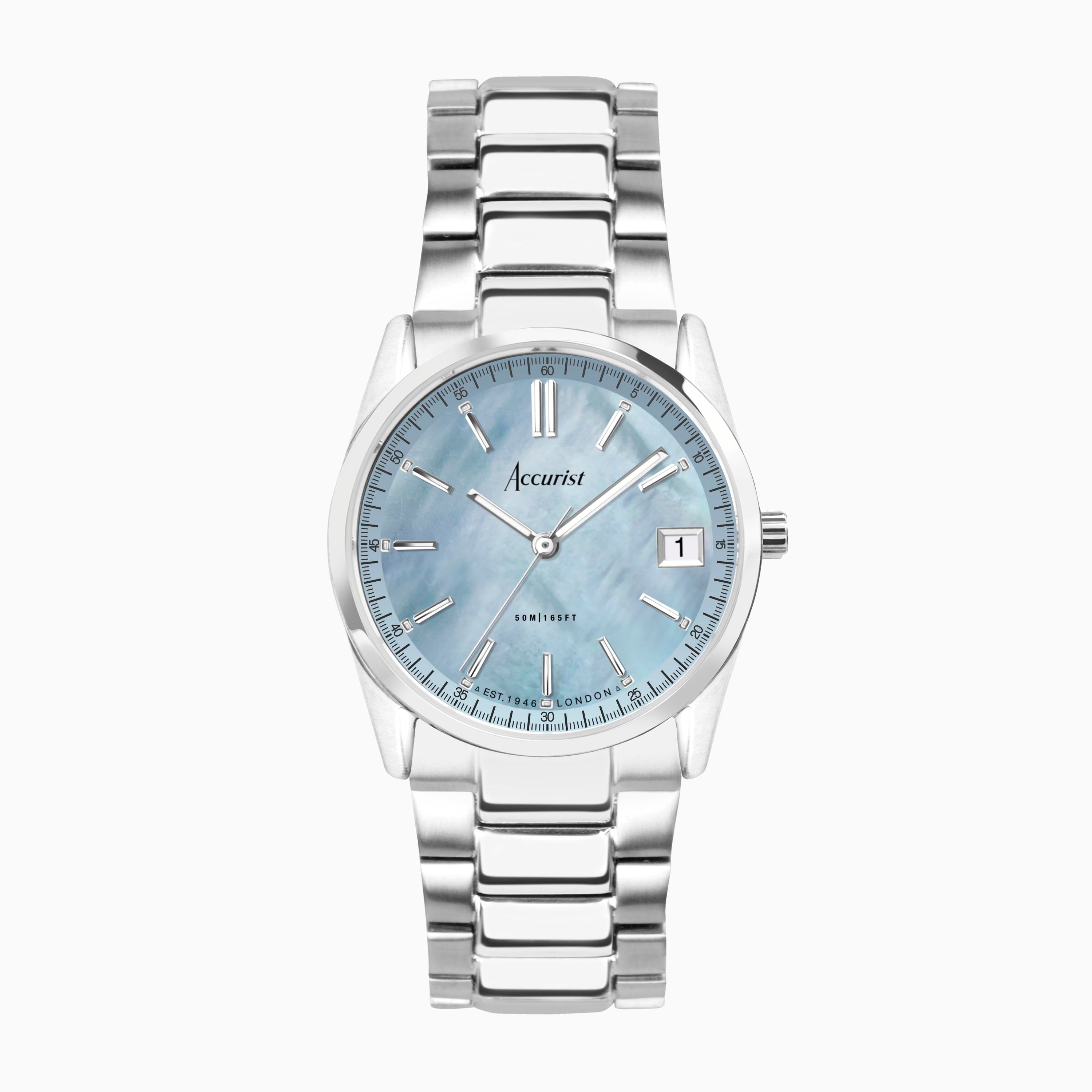 Accurist Everyday Solar Ladies Watch | Silver Stainless Steel Case & Bracelet with Blue Mother-of-Pearl Dial | 30mm