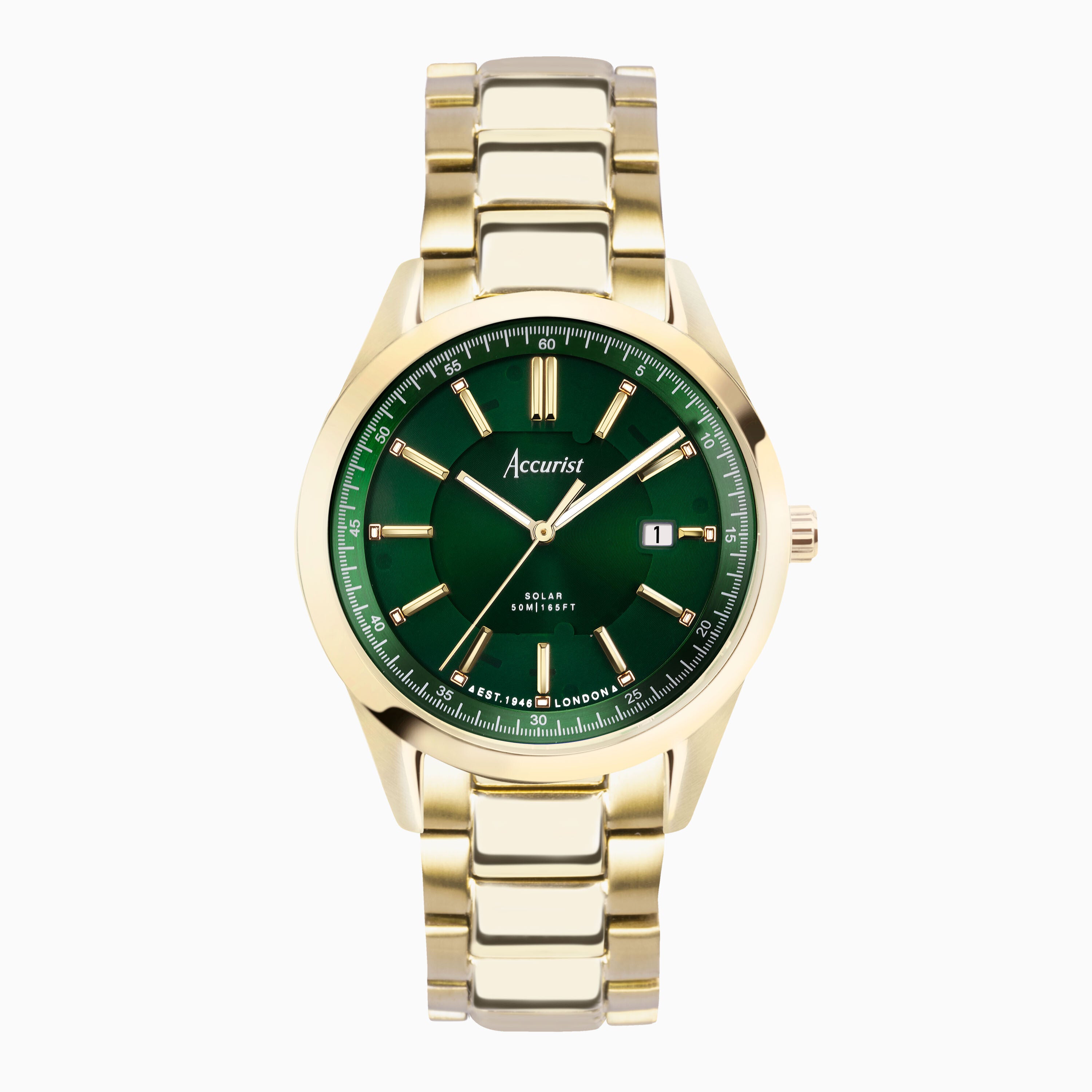 Accurist Everyday Solar Men's Watch | Gold Stainless Steel Case & Bracelet with Green Dial | 40mm