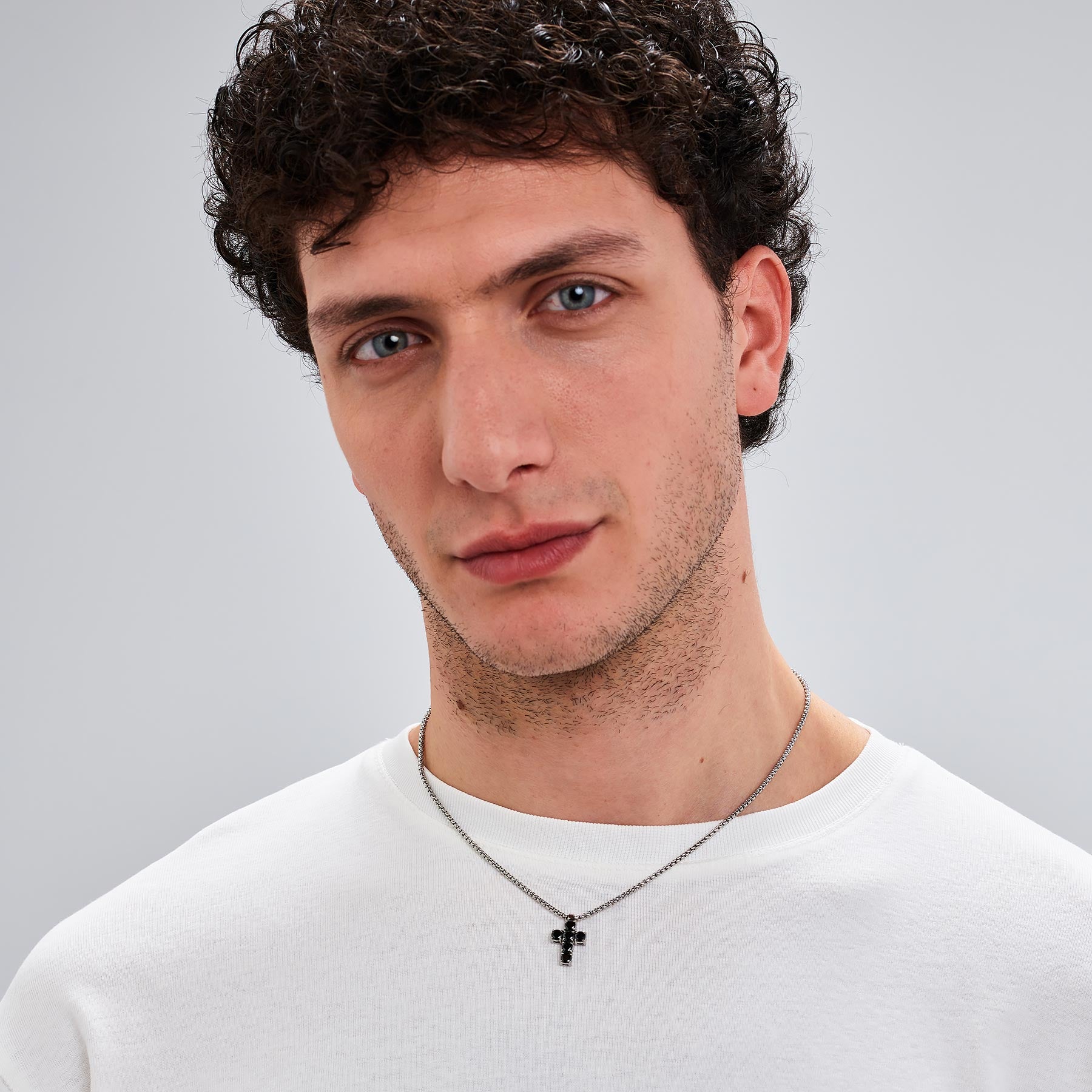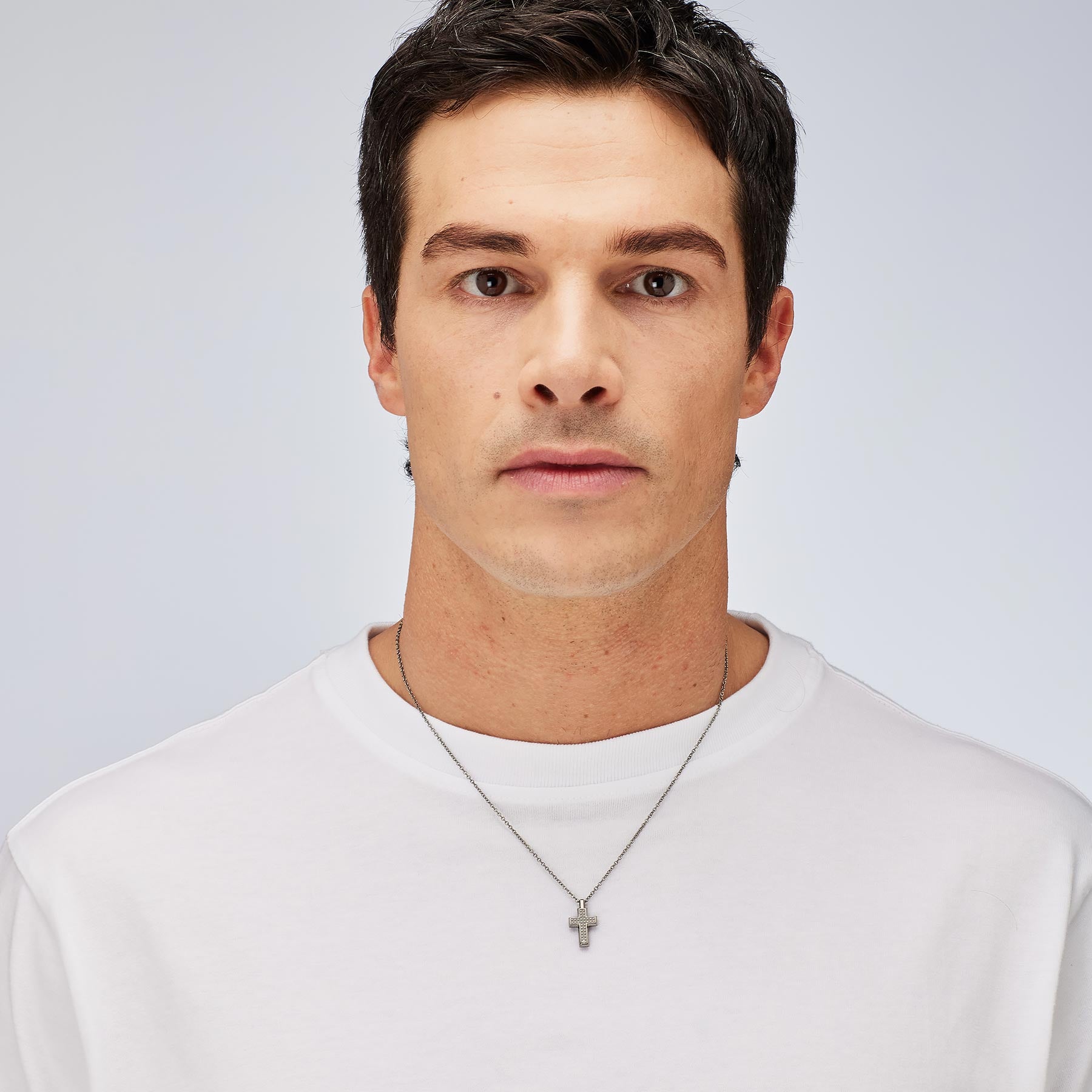 Long chain necklace in polished and sandblasted 316L steel, with a cross-shaped charm.|BUL55