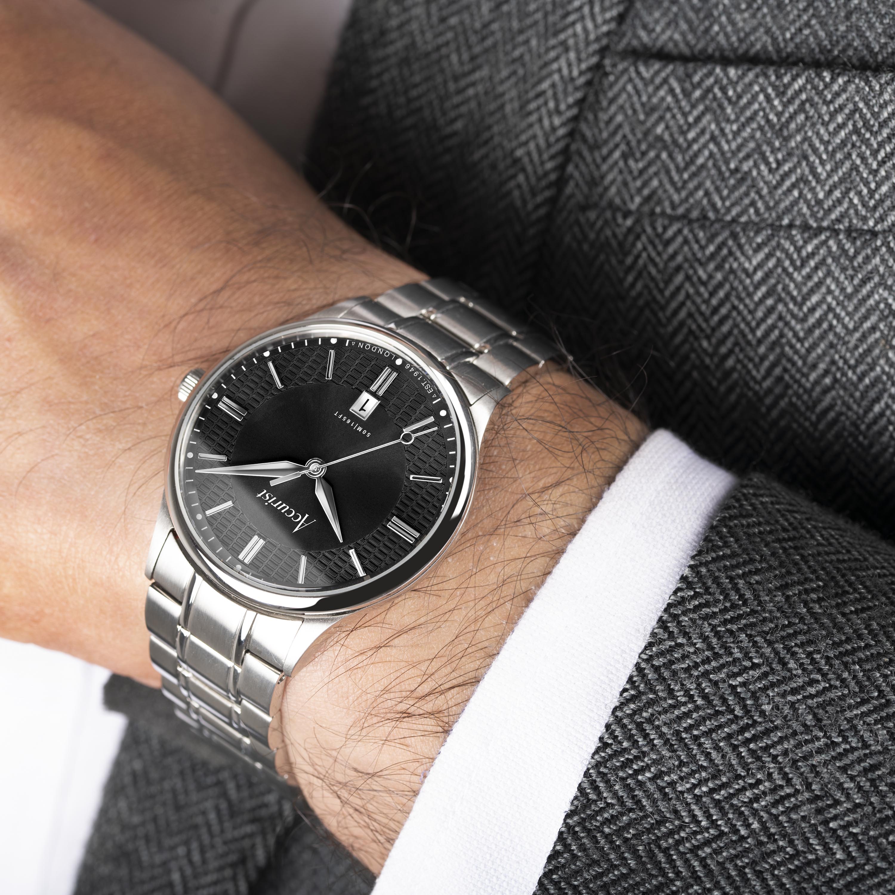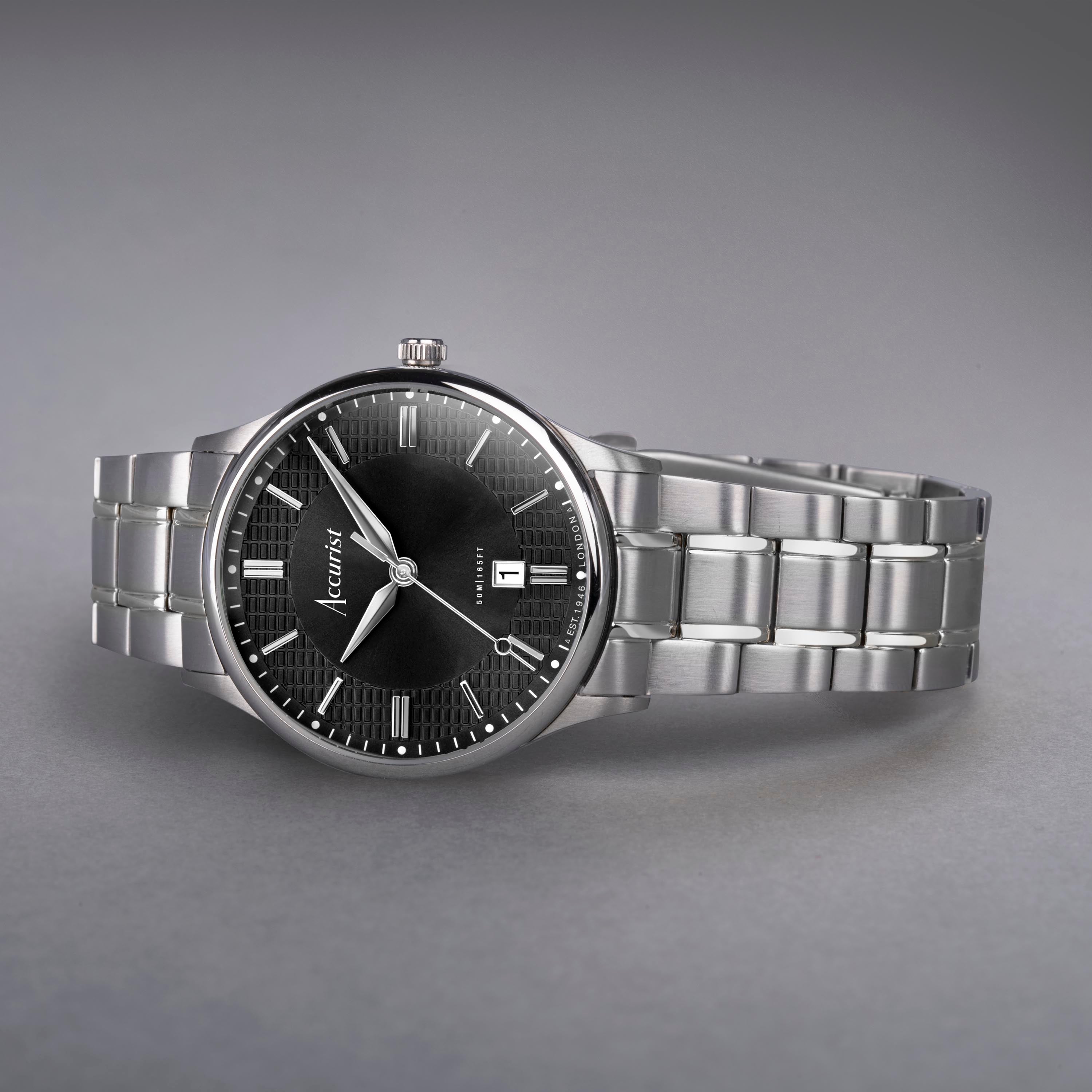 The classic collection is inspired by Accurist's heritage, from the batons to the black block textured dial with a date display and iconic Accurist lollipop second hand. This watch has a slimline stainless steel case covered by ultra scratch resistant sapphire crystal glass.