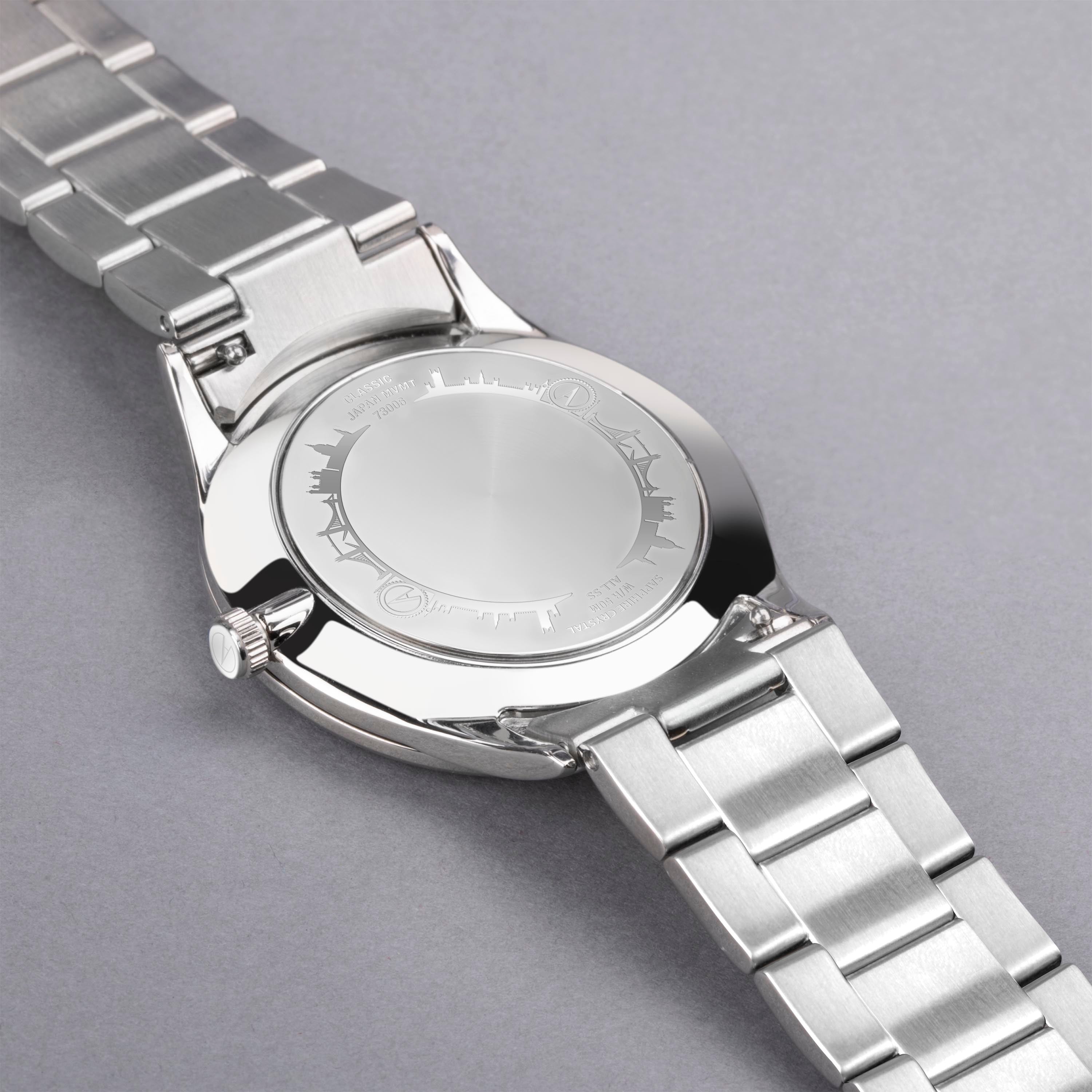 This watch has an interchangeable, stainless steel bracelet. The case back is engravable and the watch is water resistant up to 50 metres.