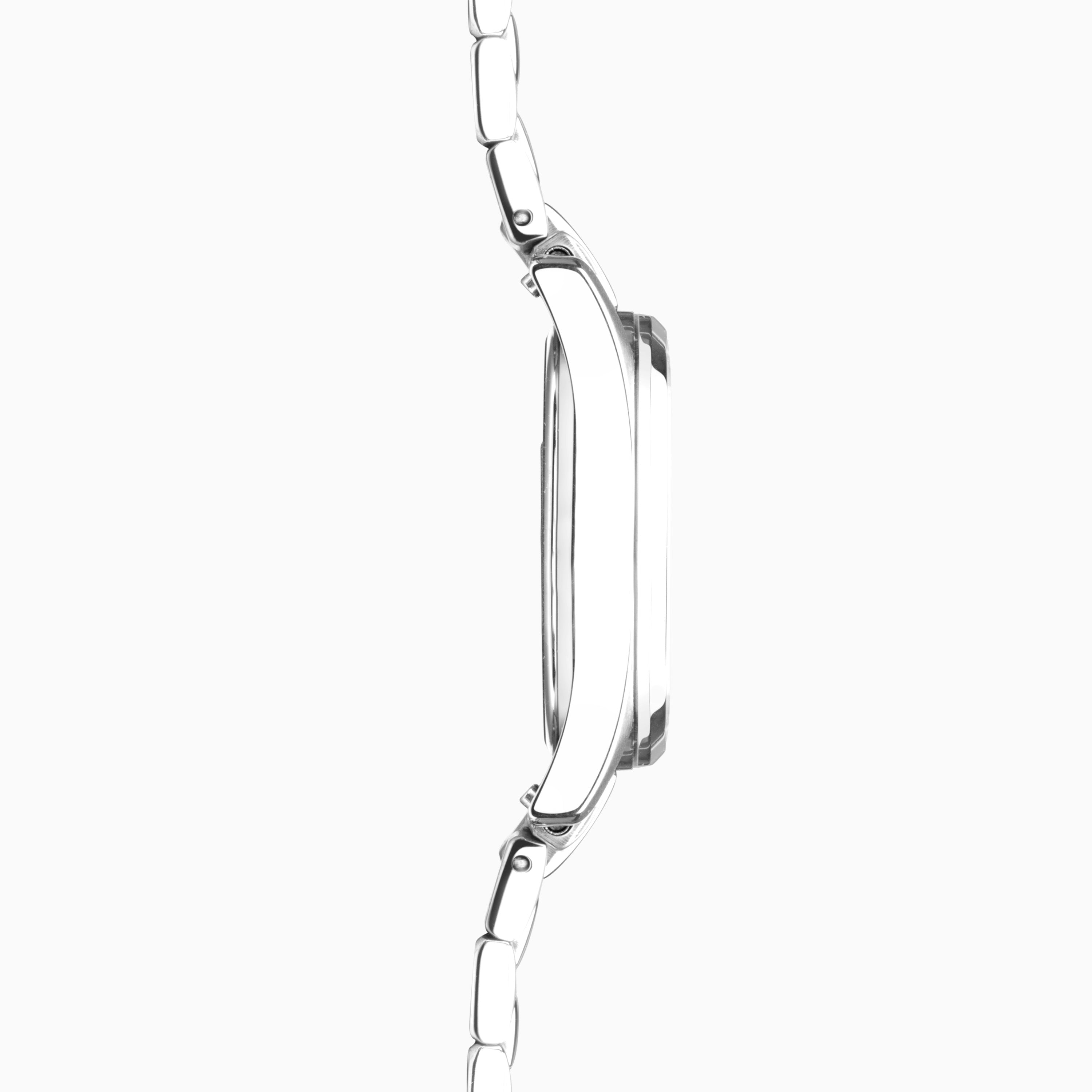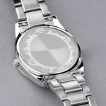 Fastened with an interchangeable stainless steel bracelet, this watch also has an engravable case back and is water resistant up to 50 metres.