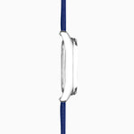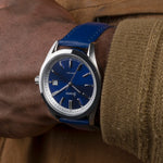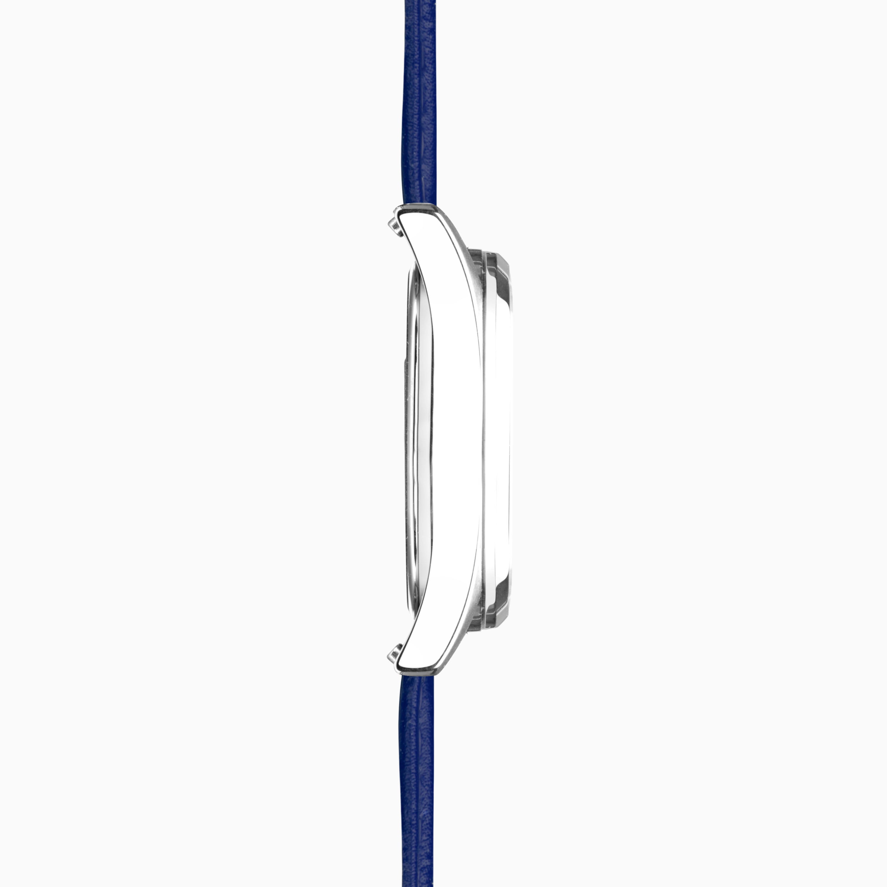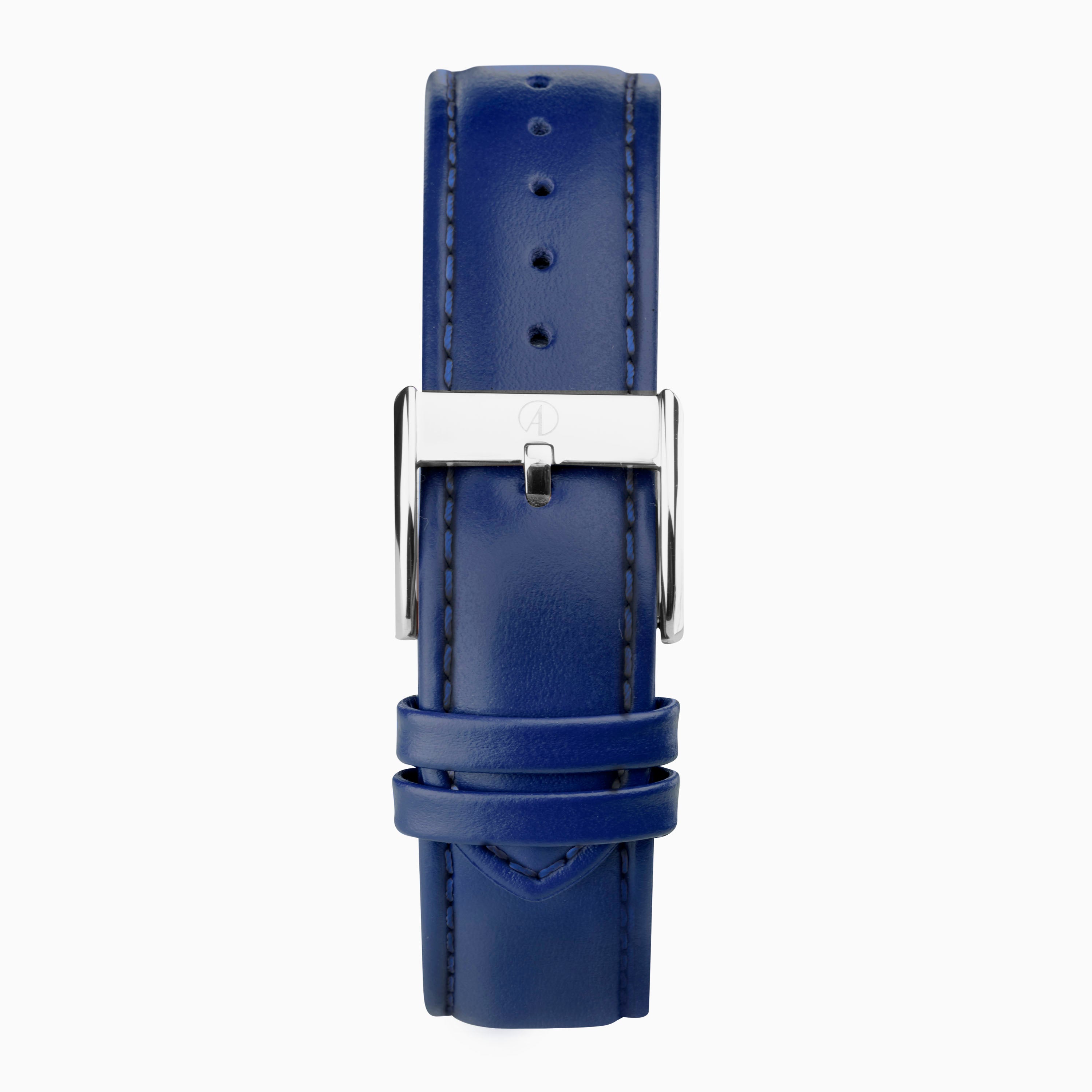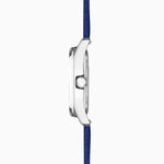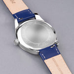 Fastened with an interchangeable, blue leather strap, this watch also has an engravable case back and is water resistant up to 50 metres.