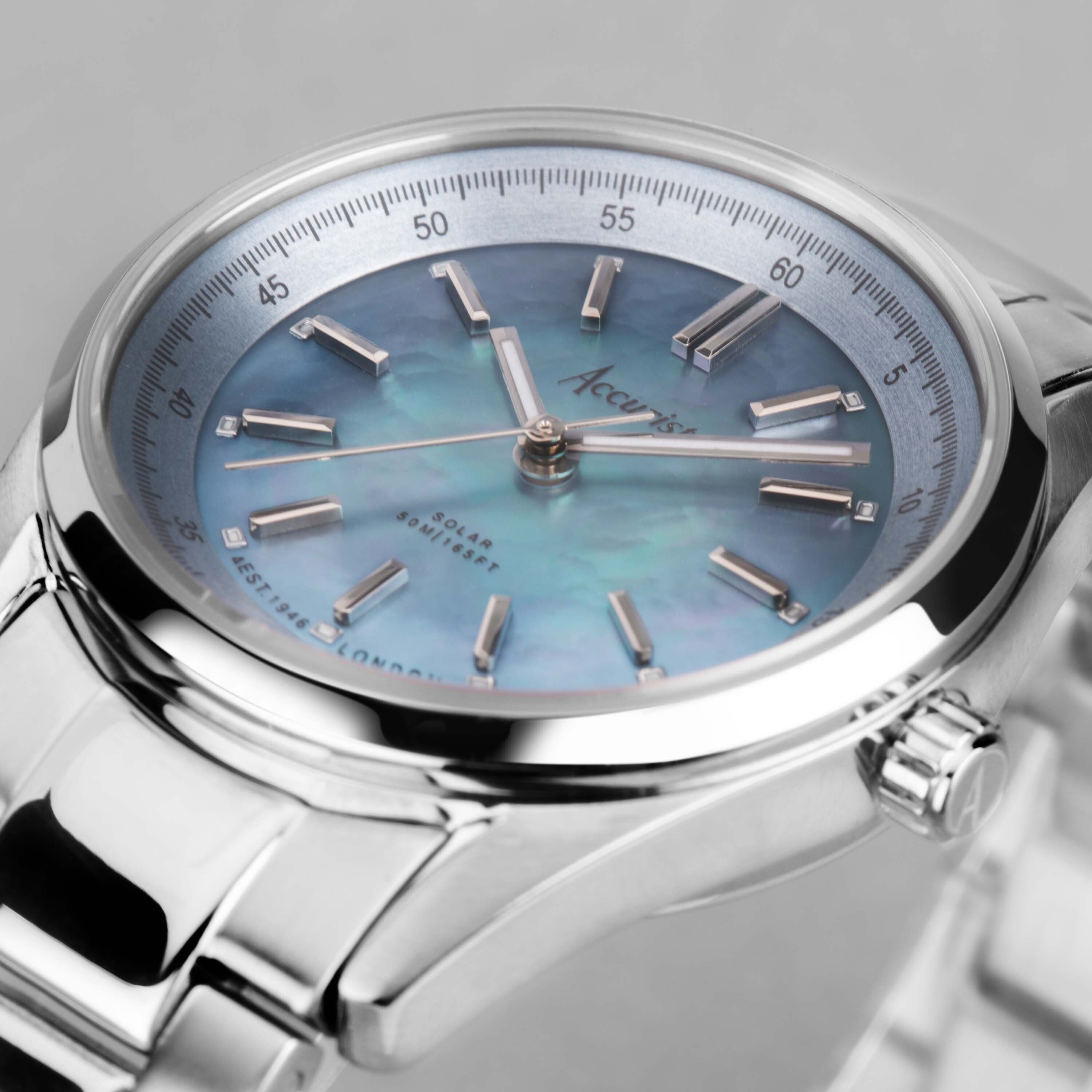 Accurist Everyday Solar Ladies Watch | Silver Stainless Steel Case & Bracelet with Blue Mother-of-Pearl Dial | 30mm