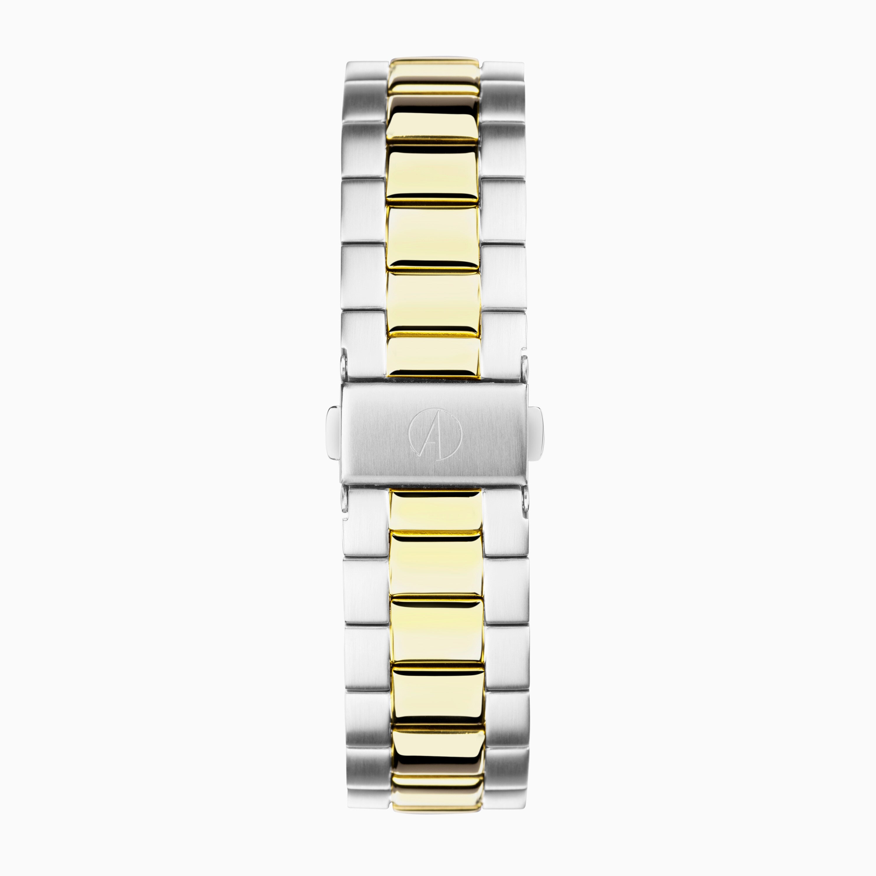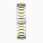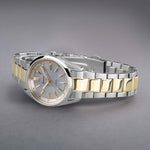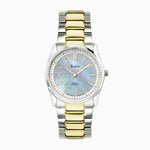 This Everyday Solar watch features a round, solid stainless steel case housing a blue Mother-of-Pearl dial, protected by ultra scratch resistant sapphire crystal glass. The watch has an interchangeable, quick release, ion-plated gold and silver two tone solid stainless steel bracelet and is water resistant up to 50 metres.