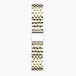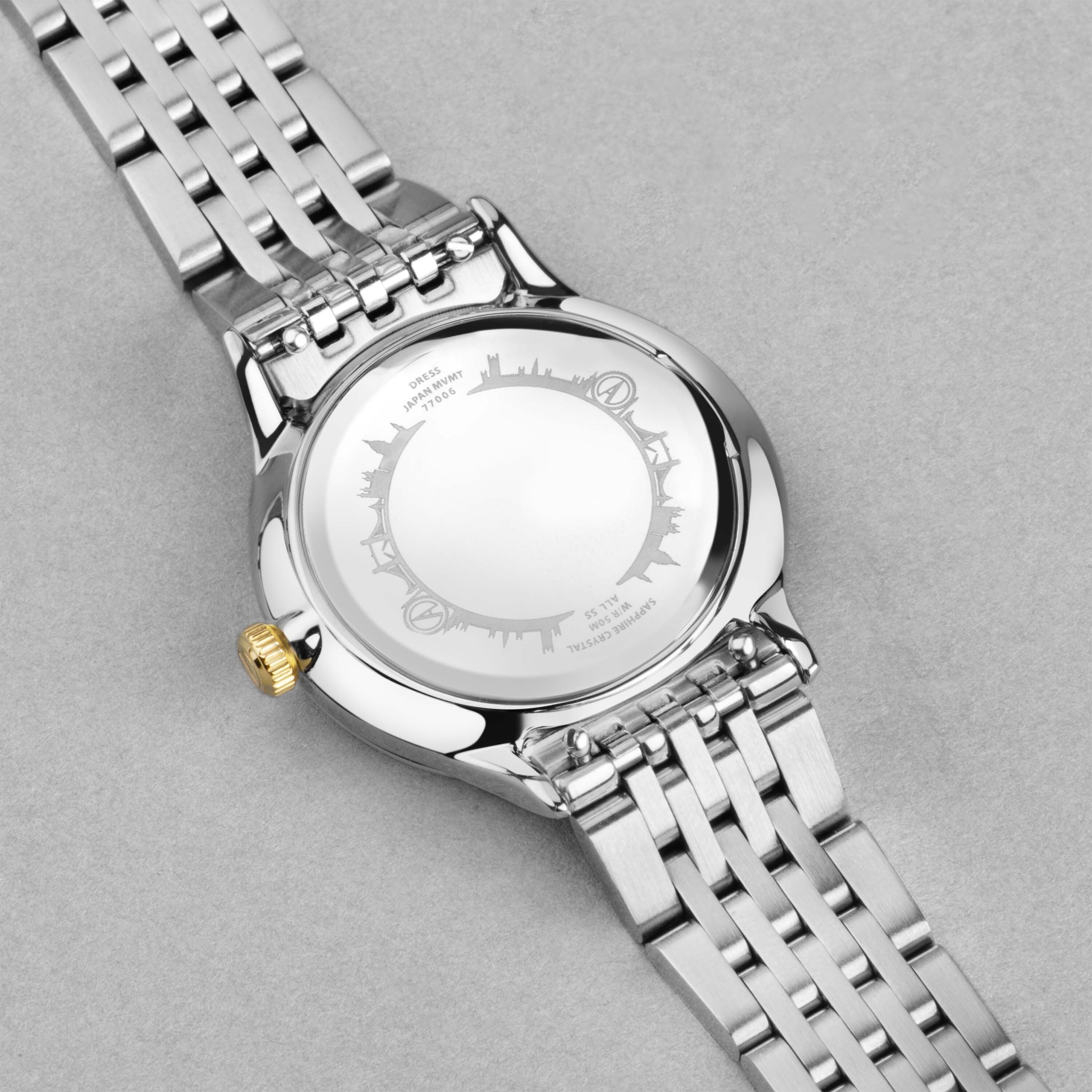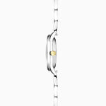 Fastened with an interchangeable two tone, ion-plated silver and gold, solid stainless steel bracelet. This watch has an engravable case back and is water resistant up to 50 metres.