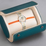 This watch features a round, solid stainless steel case housing a white Mother-of-Pearl dial stone set with 12 diamonds as hour markers and enclosed by ultra scratch resistant, curved double sapphire crystal glass.