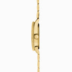 This watch has a round, ion-plated gold alloy case with a black rotating bezel, a black matte dial, a date display and luminous batons and hour markers at positions 3,6,9 and 12. The watch is fastened with an ion-plated gold stainless steel bracelet and is water resistant up to 50 metres.